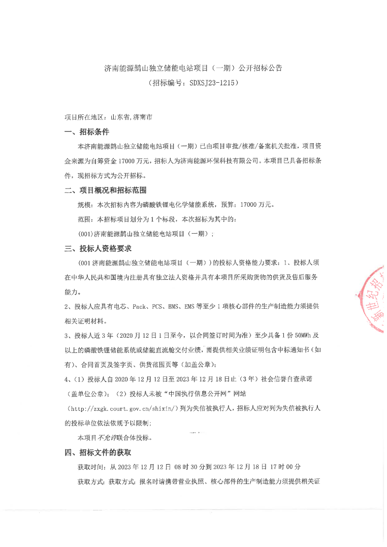 12月11日,濟南能源鵲山獨立儲能電站項目(一期)公開招標。項目預(yù)算為1.7億元,招標內(nèi)容為磷酸鐵鋰電化學儲能系統(tǒng)。