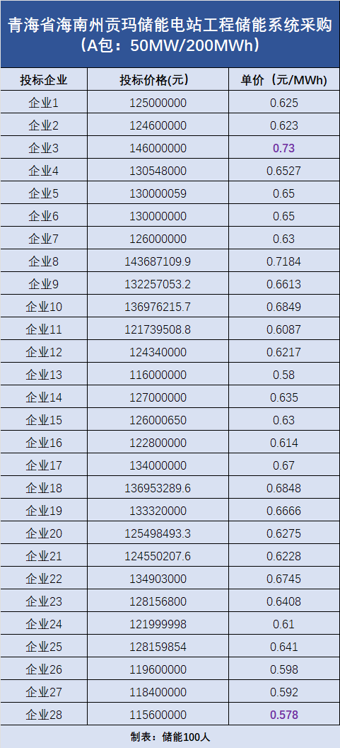 A包:容量為50MW/200MWh,共吸引了28家企業(yè)投標(biāo),最低報(bào)價(jià)為0.578元/Wh,最高報(bào)價(jià)為0.73元/Wh。(投標(biāo)報(bào)價(jià)詳情見(jiàn)下圖)