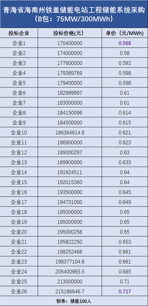 B包:規(guī)模為75MW/300MWh,共吸引了26家企業(yè)投標(biāo),最低報(bào)價(jià)為0.568元/Wh,最高報(bào)價(jià)為0.717元/Wh。(投標(biāo)報(bào)價(jià)詳情見(jiàn)下圖)