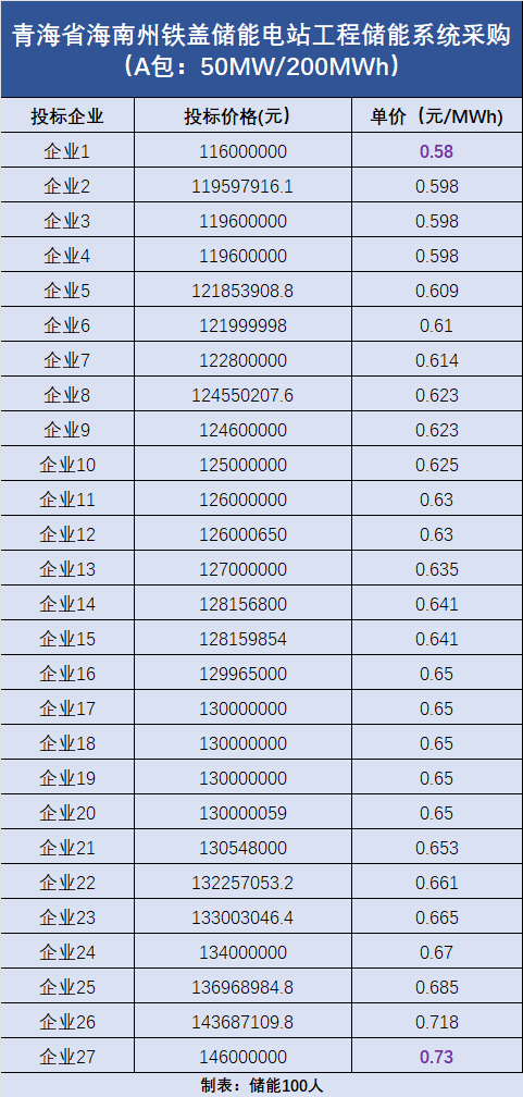 A包:容量為50MW/200MWh,共吸引了27家企業(yè)投標(biāo),最低報(bào)價(jià)為0.58元/Wh,最高報(bào)價(jià)為0.73元/Wh。(投標(biāo)報(bào)價(jià)詳情見(jiàn)下圖)