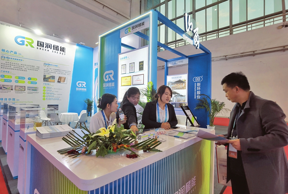 在國潤儲能展區(qū),工作人員馬倩倩結(jié)合展柜里依次擺放著的全氟離子溶液、全氟離子膜、催化劑、膜電極、電解槽、釩電解液等原料,向前來問詢的觀眾詳細(xì)解答生產(chǎn)全釩液流電池的基本過程。觀眾們一邊聽著介紹不時提出問題,一邊舉起手機(jī)拍照留下資料。