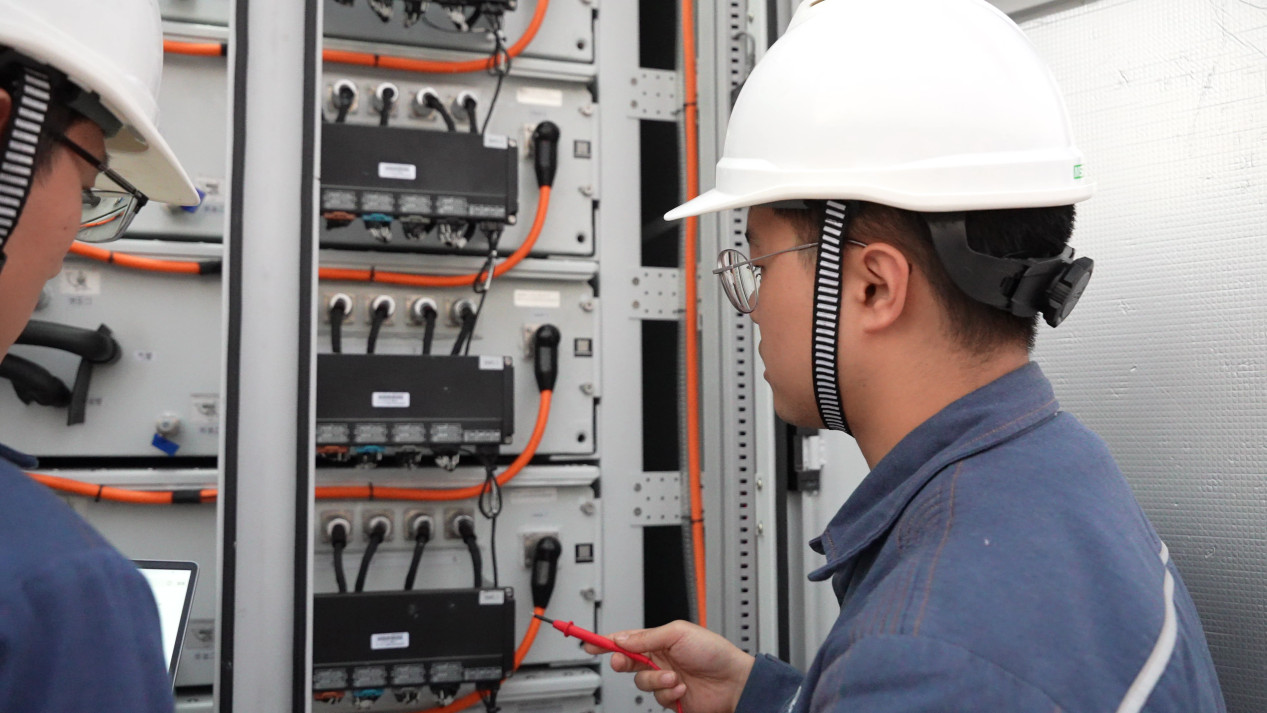 而在結構連接方面,寶塘儲能站的連接方式多達5種,組串式、雙極式、單極式、低壓級聯(lián)、高壓級聯(lián)。其中,“高壓級聯(lián)”是南方電網(wǎng)首批“揭榜掛帥制”科研項目的攻關技術,實體成果“我國首個高壓移動式儲能站”于2023年初在河北保定投運。這種新技術通過模塊級聯(lián)的方式將儲能系統(tǒng)電壓直接升至10千伏,在大幅減少儲能系統(tǒng)數(shù)量的情況下實現(xiàn)同等效率,省去變壓器的儲能系統(tǒng)可靈活移動,解決了傳統(tǒng)儲能應用場景受限的問題,迅速成為行業(yè)研發(fā)應用的“熱門”。“安裝在寶塘儲能站的兩套高壓級聯(lián)儲能系統(tǒng),相對于河北保定系統(tǒng),硬件結構及控制保護方面均實現(xiàn)了技術優(yōu)化,綜合性能更優(yōu)。”南網(wǎng)儲能高壓級聯(lián)攻關團隊成員李勇琦指著新投運的高壓級聯(lián)電池艙說道。