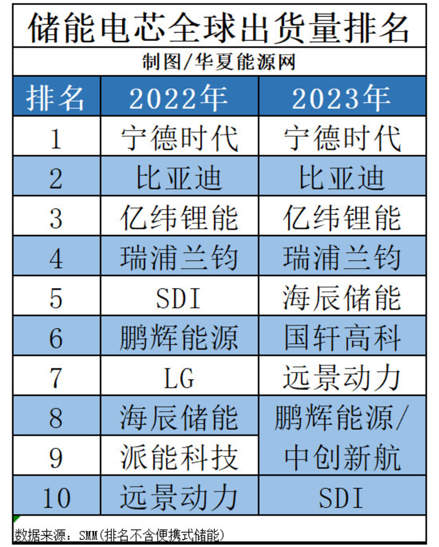 華夏能源網(wǎng)獲悉,近日,上海有色網(wǎng)(SMM)公布了2023年儲能電芯出貨量排行榜。榜單顯示,寧德時代(SZ:300750)、比亞迪(SZ:002594)、億緯鋰能(SZ:300014)位居前三甲,瑞浦蘭鈞(HK:00666)、海辰儲能、國軒高科(SZ:002074)和遠(yuǎn)景動力緊隨其后,鵬輝能源(SZ:300438)和中創(chuàng)新航(HK:03931)并列第八,來自韓國的電芯廠商三星SDI被擠到第十位。