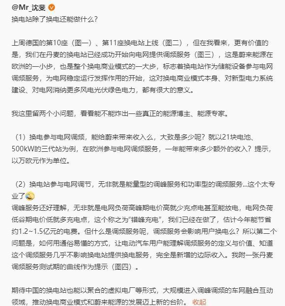 近日,智車派注意到,蔚來副總裁沈斐在微博發(fā)文稱,在丹麥的換電站已經(jīng)成功開始向電網(wǎng)提供調(diào)頻服務(wù),這是蔚來能源在歐洲的一小步,也是整個(gè)換電商業(yè)模式的一大步,標(biāo)志著換電站作為儲(chǔ)能設(shè)備參與電網(wǎng)調(diào)頻服務(wù)。沈斐表示,期待中國(guó)的換電站也能以聚合的虛擬電廠等形式,大規(guī)模進(jìn)入調(diào)峰調(diào)頻的車網(wǎng)融合互動(dòng)領(lǐng)域。