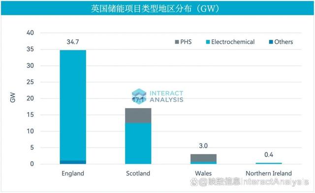 英國是全球重要的新型儲(chǔ)能市場,與德意等以戶儲(chǔ)為主的歐洲國家不同,大規(guī)模儲(chǔ)能在英國占據(jù)主導(dǎo)地位。據(jù)Interact Analysis全球儲(chǔ)能項(xiàng)目統(tǒng)計(jì),截至2023年底,英國儲(chǔ)能項(xiàng)目總規(guī)模約55GW(含在規(guī)劃、在建及已投運(yùn)的儲(chǔ)能項(xiàng)目),其中規(guī)劃及在建項(xiàng)目50GW。抽水蓄能項(xiàng)目總規(guī)模約6.7GW,新型儲(chǔ)能項(xiàng)目規(guī)模超48GW。