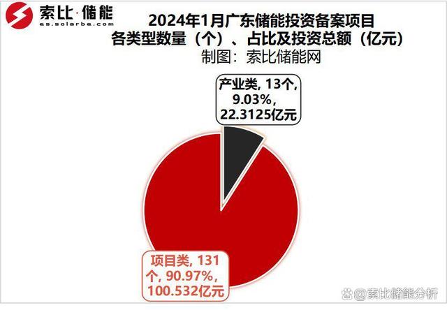 據(jù)索比儲(chǔ)能網(wǎng)不完全統(tǒng)計(jì),2024年1月,廣東省儲(chǔ)能投資備案項(xiàng)目144個(gè),總投資金額達(dá)122.8444995億元。其中產(chǎn)業(yè)類(lèi)項(xiàng)目13個(gè),投資額22.3125億元;項(xiàng)目類(lèi)131個(gè),規(guī)模為2723.523MW/ 5727.044MWh,投資金額100.5319995億元。