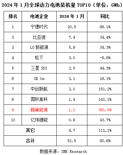值得一提的是,1月份蜂巢能源裝機同比增長381.0%,在全球TOP10電池企業(yè)中增速最高。