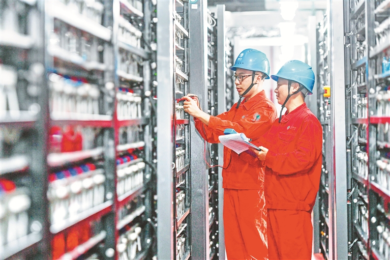 國家電網(wǎng)浙江省湖州市長興縣供電公司的工作人員正在蓄電池室檢測并網(wǎng)后單個蓄電池的電壓。圖片來源:視覺中國