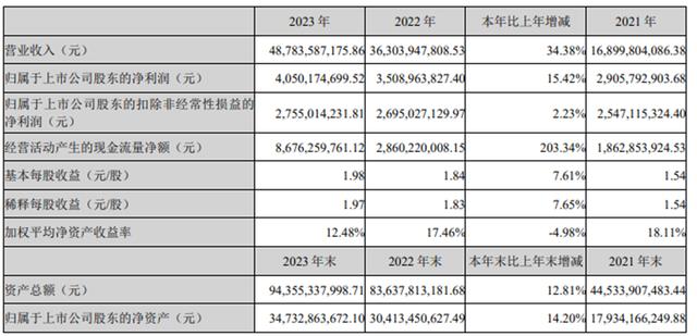 2023年,億緯鋰能實(shí)現(xiàn)營(yíng)業(yè)收入487.8億元,同比增長(zhǎng)32.38%;歸母凈利潤(rùn)為40.5億元,同比增長(zhǎng)15.42%,其中本部業(yè)務(wù)凈利潤(rùn)為35.4億元,同比增長(zhǎng)30.19%;扣非更是同比只增長(zhǎng)2.23%;毛利率達(dá)到17.04%,同比增長(zhǎng)0.61個(gè)百分點(diǎn);凈利率達(dá)到9.27%,同比降低0.84個(gè)百分點(diǎn)。