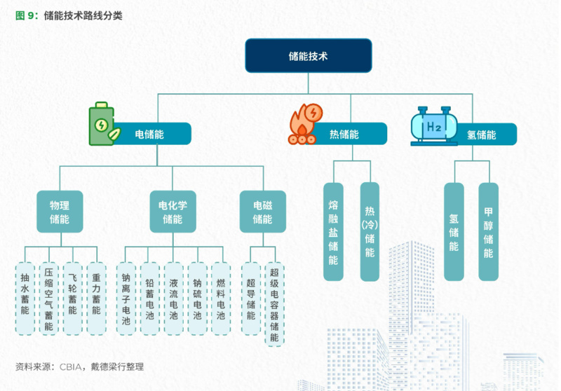 儲能,是指通過不同方式、利用特定的裝置或物理介質(zhì),將不同形式的能量儲存起來,以便在需要時利用的技術(shù)。根據(jù)技術(shù)路徑不同,儲能形式主要分為電儲能、熱儲能和氫儲能三大類,其中電化學(xué)與物理儲能為現(xiàn)階段主要技術(shù)路線。儲能系統(tǒng)是新型電力系統(tǒng)有效的調(diào)峰調(diào)頻、平滑波動手段及重要的備用資源,大力發(fā)展儲能對提高光伏、風(fēng)電等可再生能源利用率,實現(xiàn)“雙碳”目標(biāo)具有重要意義。