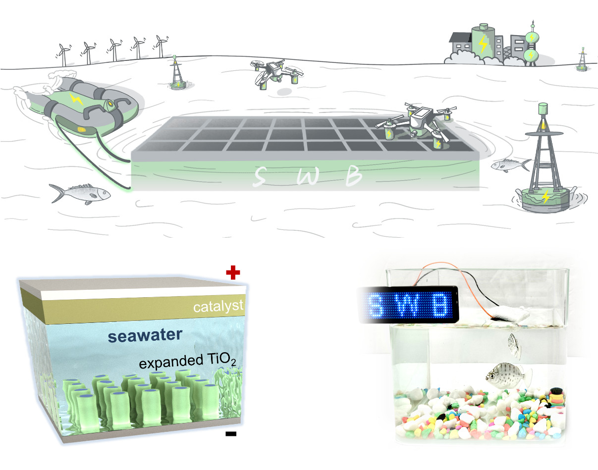 (c)常規(guī)和晶格膨脹的銳鈦礦TiO2在海水中不同陽離子嵌入差別的示意圖;(d)本文構(gòu)筑的開放型可充放電海水電池的結(jié)構(gòu)示意圖。