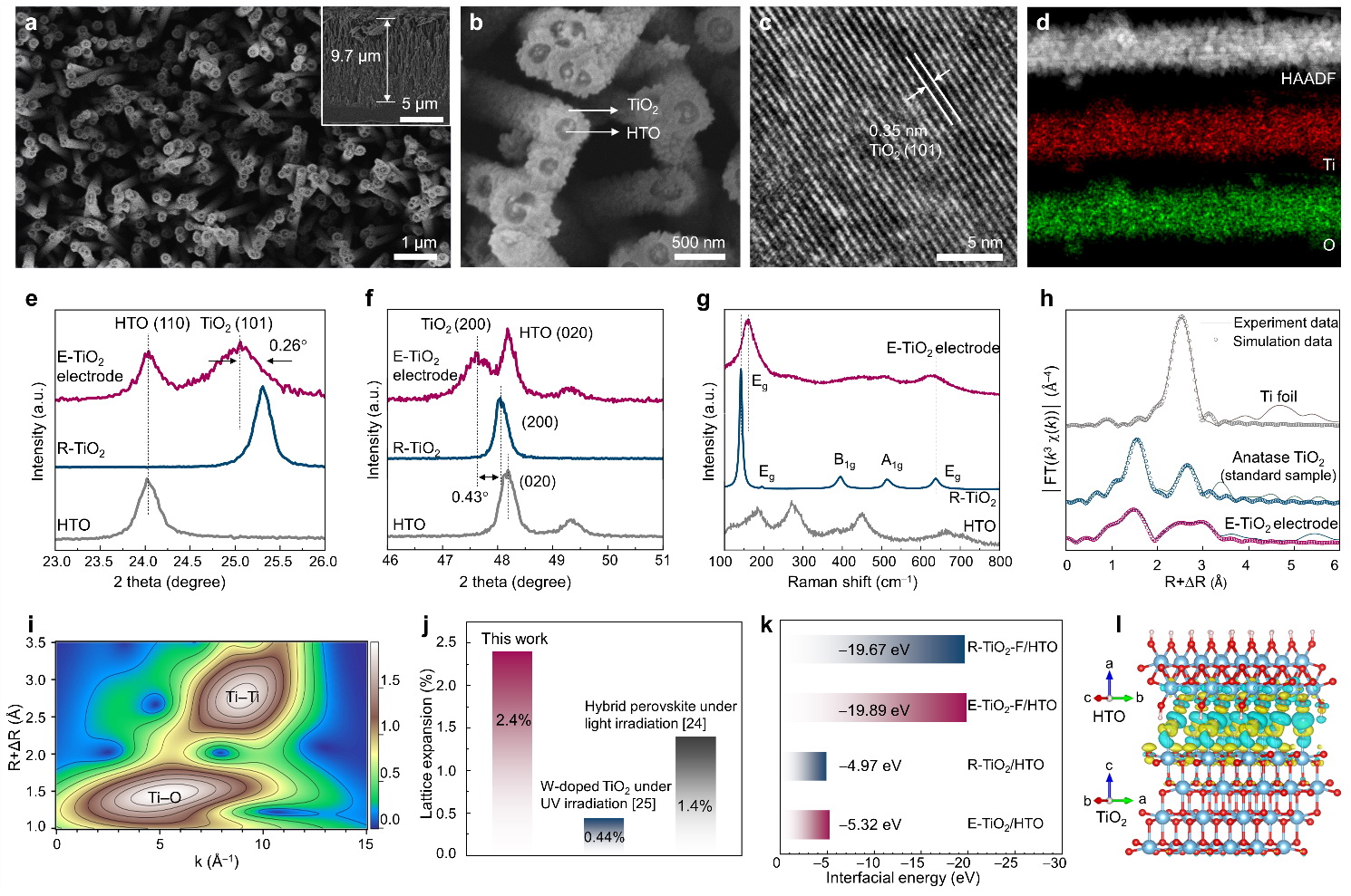 要點(diǎn)2:SEM(圖2a,b)表明晶格膨脹二氧化鈦(E-TiO2)具有核殼結(jié)構(gòu)的納米線陣列。SAED以及HRTEM發(fā)現(xiàn)E-TiO2中的TiO2和HTO均為準(zhǔn)單晶結(jié)構(gòu)(圖2c)。EDSmapping表明O元素與Ti元素的均勻分布(圖2d)。XRD圖譜表明E-TiO2在(101)、(004)和(200)三個晶面方向?qū)?yīng)的布拉格衍射峰均有明顯的小角度偏移(圖2e,f)。結(jié)合XRD精修得出E-TiO2的晶胞體積膨脹率為2.4%。拉曼測試表明E-TiO2位于142 cm–1和638 cm–1處的特征峰分別發(fā)生藍(lán)移和紅移的現(xiàn)象,證明了Ti-O鍵長的增加(圖2g)。最后,利用XAFS進(jìn)一步分析Ti的價態(tài)以及鍵長(圖2h,i),結(jié)果表明Ti-Ti鍵的長度增加,進(jìn)一步佐證了晶格的膨脹。與實現(xiàn)晶格膨脹的常規(guī)方法相比,該研究在無需外場輔助的情況下即可實現(xiàn)(圖2j)。為了進(jìn)一步深入分析晶格膨脹的機(jī)理,通過DFT比較了HTO分別與R-TiO2和E-TiO2的界面能(圖2k)。圖 2l 中的微分電荷密度計算表明氟原子可以有效地在HTO (100)和TiO2 (001)之間通過H-F共價鍵形成連接(圖2k),誘導(dǎo)具有膨脹晶格的銳鈦礦TiO2生長。