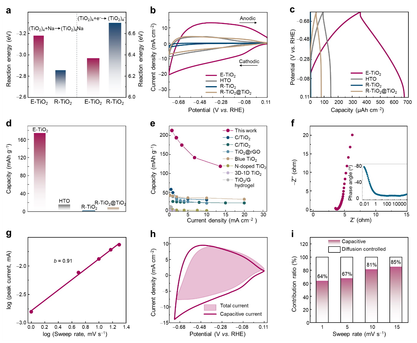 (f)晶格膨脹二氧化鈦的EIS結(jié)果;(g)b值;(h)電容/擴(kuò)散行為分析;(i)不同掃速下電容與擴(kuò)散控制對容量的貢獻(xiàn)率。