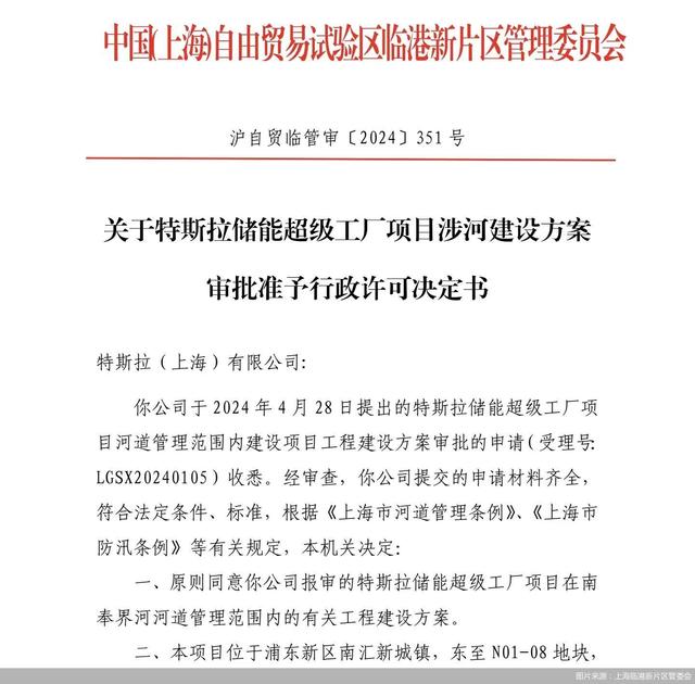 5月8日,上海臨港新片區(qū)管委會官網顯示,已公布關于與特斯拉儲能超級工廠項目涉河建設方案審批準予行政許可決定書,同意特斯拉(上海)報審的特斯拉儲能超級工廠項目在南奉界河河道管理范圍內的有關工程建設方案。
