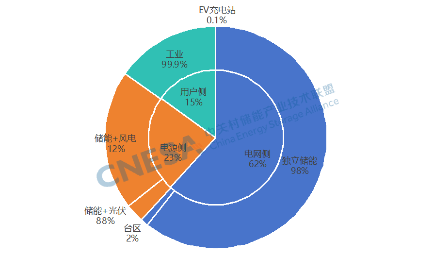 獨(dú)立儲(chǔ)能占比回升,獨(dú)立儲(chǔ)能、新能源配儲(chǔ)主導(dǎo)市場(chǎng)。從應(yīng)用分布上看,
