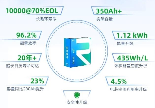 再加上融合電化學(xué)固液界面技術(shù)等多項(xiàng)創(chuàng)新技術(shù),使得電芯內(nèi)部空間的利用效率得到進(jìn)一步提升。以問(wèn)頂345Ah儲(chǔ)能電芯為例,實(shí)際容量超350Ah,能量升級(jí)至1.12 kWh,體積能量密度升級(jí)至440Wh/L,能量效率達(dá)96.2%,可減少能量轉(zhuǎn)換損耗降低7%成本,相當(dāng)于又一次升級(jí)了大儲(chǔ)產(chǎn)品力。