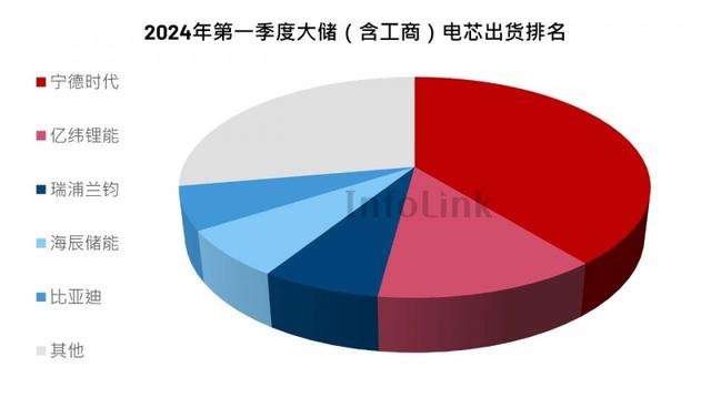 有所不同的是,參照2023年,今年Q1頭部企業(yè)格局發(fā)生改變:除了寧德時(shí)代市占率領(lǐng)先穩(wěn)坐龍頭、海辰儲(chǔ)能仍舊第五的位置不變之外,比亞迪從第二退居第四,億緯鋰能憑借大額訂單的儲(chǔ)能電池出貨量同比增長(zhǎng)翻倍,升至第二,瑞浦蘭鈞則延續(xù)去年的出貨勢(shì)頭上升一個(gè)名次,位居第三。