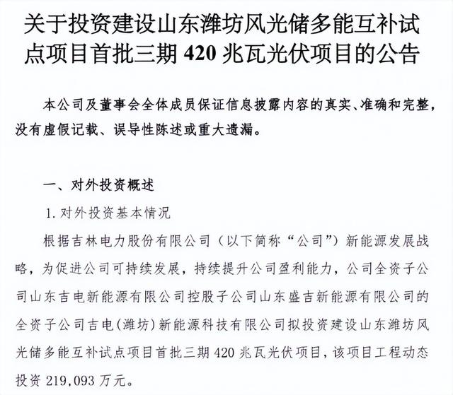 5月30日,吉電股份發(fā)布關(guān)于投資建設(shè)山東濰坊風(fēng)光儲多能互補試點項目首批三期420兆瓦光伏項目的公告。