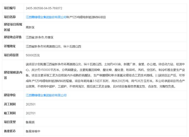 該項(xiàng)目編號(hào)為2405-360598-04-05-769372,項(xiàng)目名稱為“江西贛鋒鋰業(yè)集團(tuán)股份有限公司年產(chǎn)5萬(wàn)噸鋰電新能源材料項(xiàng)目”。贛鋒鋰業(yè)作為建設(shè)單位,此次項(xiàng)目的開工時(shí)間定于2025年1月,預(yù)計(jì)竣工時(shí)間為2027年1月,項(xiàng)目類型為備案類,目前備案狀態(tài)為備案審核中。