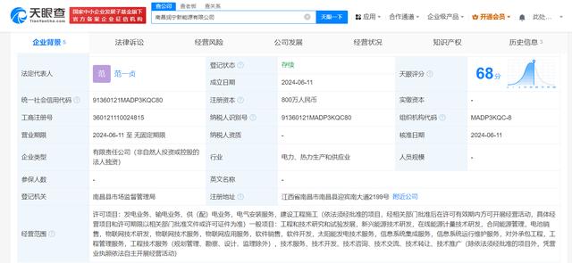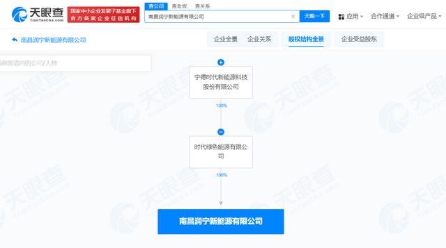 近日,南昌潤寧新能源有限公司成立,法定代表人為范一貞,注冊資本800萬人民幣,經營范圍含工程和技術研究和試驗發(fā)展、新興能源技術研發(fā)、在線能源計量技術研發(fā)、合同能源管理、電池銷售等。股權全景穿透圖顯示,該公司由時代綠色能源有限公司全資持股,后者為寧德時代(300750)全資子公司。