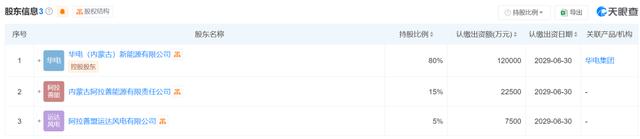 據(jù)信息顯示,內蒙古華電阿拉善綠色能源有限公司的法定代表人是盧茂茂。該公司由華電(內蒙古)新能源有限公司、內蒙古阿拉善能源有限責任公司、以及阿拉善盟運達風電有限公司共同持有股份,其中中國華電旗下的華電(內蒙古)新能源有限公司持有80%的股份。