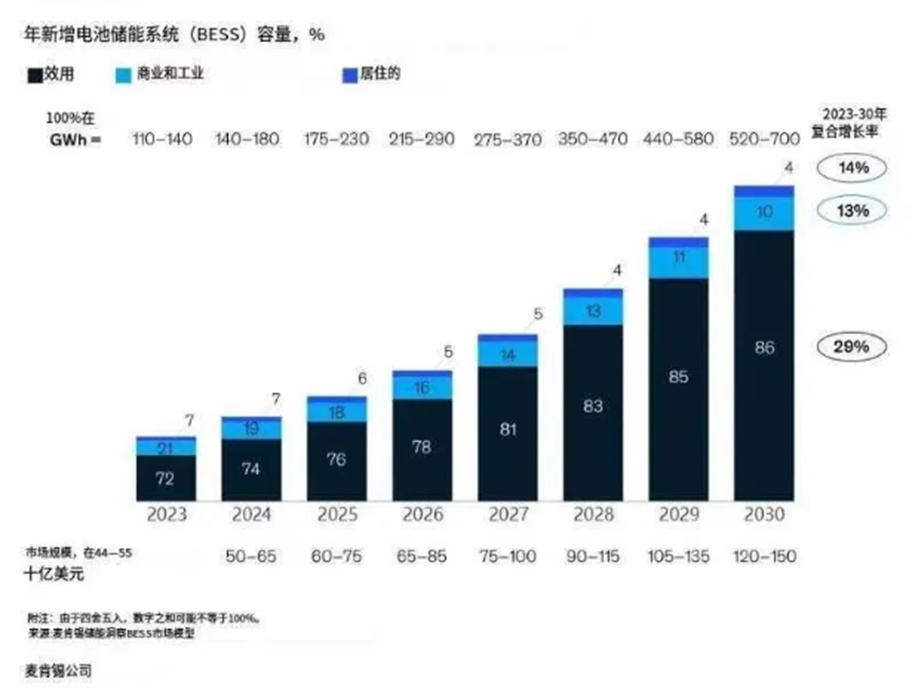 跨國(guó)知名咨詢(xún)公司麥肯錫預(yù)計(jì):公用事業(yè)規(guī)模的電化學(xué)儲(chǔ)能(已占新增年產(chǎn)能的大部分)將在未來(lái)六年中每年都保持增長(zhǎng)29% 左右,是三個(gè)細(xì)分市場(chǎng)中增長(zhǎng)最快的。2030年,電池儲(chǔ)能系統(tǒng)的市場(chǎng)容量可能會(huì)增加5倍。到2030 年,公用事業(yè)規(guī)模的年度裝機(jī)容量將達(dá)到 450 至 620 吉瓦時(shí)(gwh),公用事業(yè)規(guī)模的電化學(xué)儲(chǔ)能將占據(jù)當(dāng)年總市場(chǎng)的90%,全球電化學(xué)儲(chǔ)能全部市場(chǎng)需求將達(dá)到700gwh,1200億至1500 億美元,或1萬(wàn)億人民幣左右。
