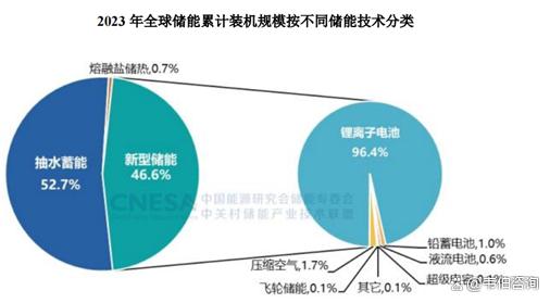 據(jù)CNESA統(tǒng)計(jì),截至2023年底全球新型儲能市場累計(jì)裝機(jī)規(guī)模約為91.326GW,較上一年末增長99.6%,其中鋰離子電池儲能市場份額96.9%,占據(jù)絕對主導(dǎo)地位。