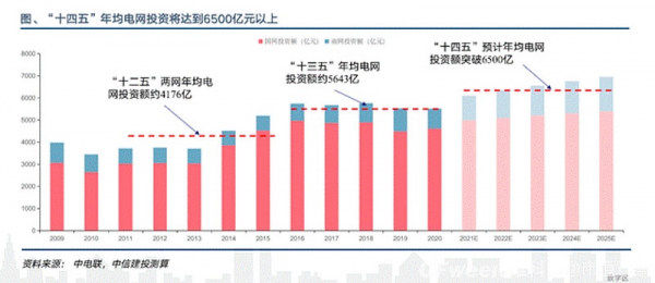 國家電網公司董事長辛保安此前披露,“十四五”期間國家電網計劃投入3500億美元(約2.23萬億元),推進電網轉型升級。
