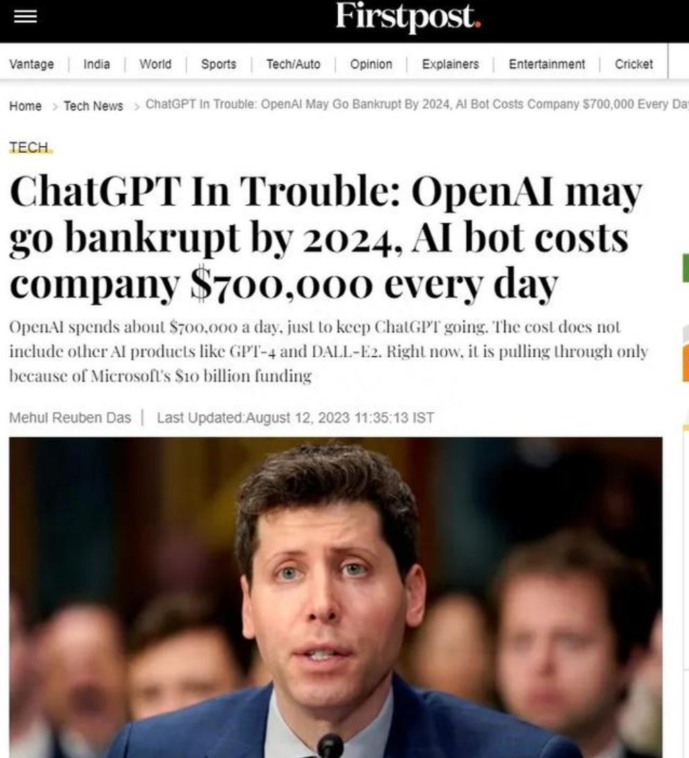 2023 年 1 月,投資銀行摩根士丹利的一份分析報告稱,在 ChatGPT 上回復(fù)的成本約為谷歌搜索查詢平均成本的 6 倍至 28 倍。根據(jù)摩根士丹利最近的分析,谷歌去年 3.3 萬億次搜索的平均成本約為每次 0.2 美分。因此可以看出,ChatGPT 聊天回復(fù)成本為 1.2 美分至 5.6 美分之間。根據(jù)公開的信息顯示,GPT4 一次完整的訓(xùn)練大約需要 6000 多萬美元,報道所說的 ChatGPT 每天耗費 70 萬美元,應(yīng)該主要是數(shù)據(jù)中心的日常算力消耗。僅在 2022 年 OpenAI 的財務(wù)凈虧損就高達(dá) 5.45 億美元。甚至有印度媒體聲稱 OpenAI 有在 2024 年倒閉的可能。