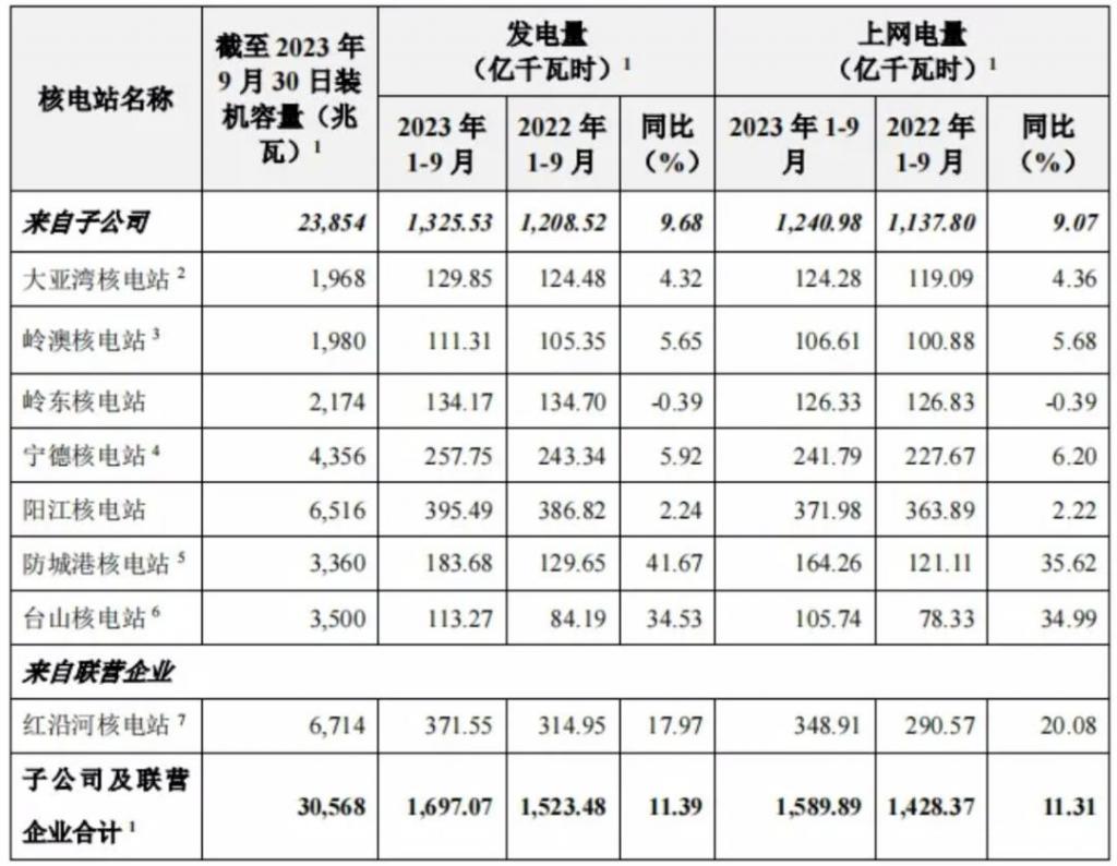 中國廣核是目前國內(nèi)最大的核電公司,目前尚未發(fā)布 2023 年年報,以 2023 年三季報數(shù)據(jù)來看,截至 2023 年 9 月 30 日,中國廣核總發(fā)電量為 1697.07 億千瓦時,平均到每季度,算上其 11.39% 左右的增幅,2023 年全年發(fā)電量最高不超過 2300 億千瓦時。