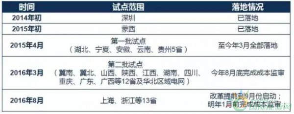 原定2017年開(kāi)展的14個(gè)省級(jí)電網(wǎng)輸配電價(jià)改革提前至2016年9月啟動(dòng),基本實(shí)現(xiàn)省級(jí)電網(wǎng)的全覆蓋;計(jì)劃于2017年1月底完成成本監(jiān)審工作。