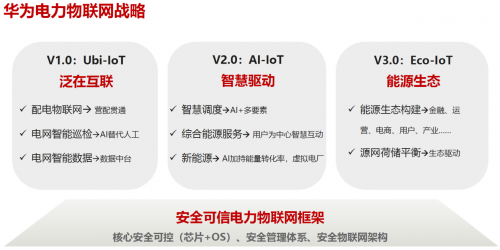 華為中國企業(yè)解決方案CTO董偉嗣表示:“電力物聯(lián)網(wǎng)是電網(wǎng)數(shù)字化轉(zhuǎn)型的引擎,其業(yè)務(wù)實(shí)質(zhì)是實(shí)現(xiàn)電網(wǎng)數(shù)字化、運(yùn)營數(shù)字化和以客戶為中心的綜合能源服務(wù),并推動能源生態(tài)的轉(zhuǎn)變、優(yōu)化源網(wǎng)荷儲平衡。華為電力物聯(lián)網(wǎng)戰(zhàn)略目標(biāo)是:打造安全可信電力物聯(lián)網(wǎng)框架,并結(jié)合電力業(yè)務(wù)場景,以泛在互聯(lián)Ubi-IoT、智慧驅(qū)動AI-IoT和能源生態(tài)Eco-IoT三個階段進(jìn)行發(fā)展演進(jìn)。
