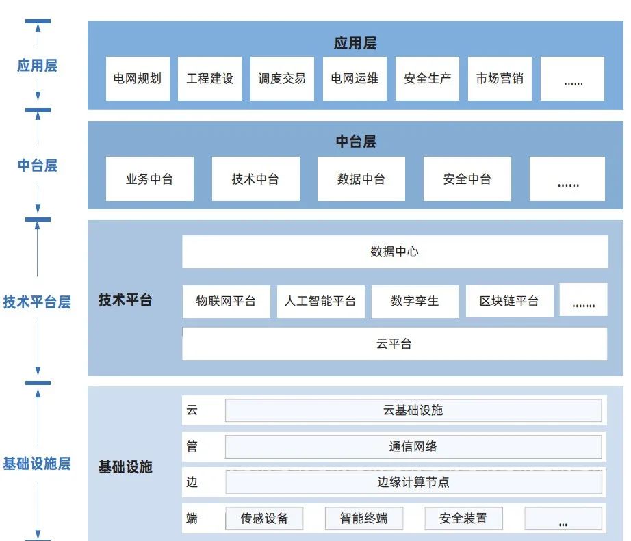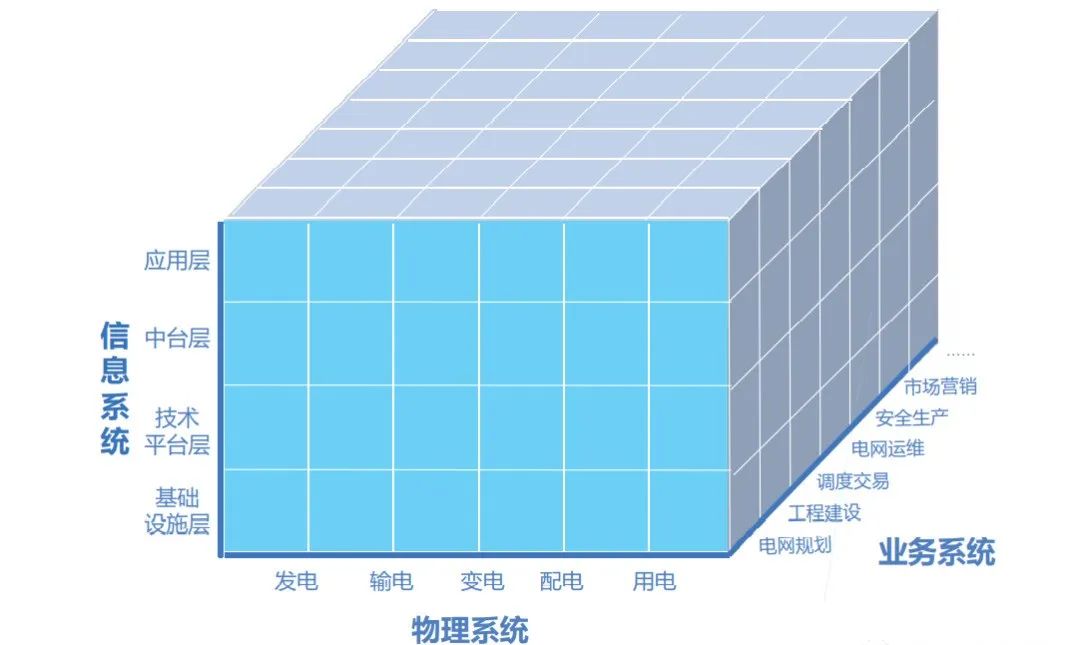 數(shù)字電網(wǎng)技術(shù)體系按照數(shù)字電網(wǎng)理論模型,由物理系統(tǒng)、信息系統(tǒng)、業(yè)務(wù)系統(tǒng)構(gòu)成。如下圖的三維立體結(jié)構(gòu)描述了數(shù)字電網(wǎng)技術(shù)體系架構(gòu),物理系統(tǒng)以發(fā)、輸、變、配、用為主線,業(yè)務(wù)系統(tǒng)分為電網(wǎng)規(guī)劃、工程建設(shè)、調(diào)度交易、電網(wǎng)運(yùn)維、安全生產(chǎn)、市場營銷、人財物管理、黨政工團(tuán)等方面;信息系統(tǒng)包 括基礎(chǔ)設(shè)施層、技術(shù)平臺層、中臺層、應(yīng)用層。