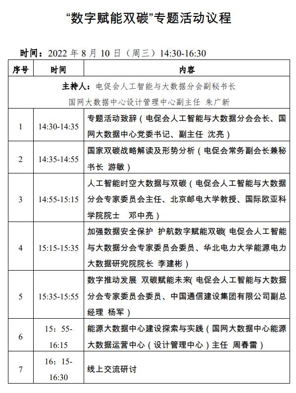 8月10日下午2點半,數(shù)字賦能雙碳線上沙龍直播,中國電力發(fā)展促進會大數(shù)據(jù)與人工智能分會邀您參加!國網(wǎng)大數(shù)據(jù)中心領(lǐng)導(dǎo)、電促會領(lǐng)導(dǎo)、歐亞科學(xué)院院士北京郵電大學(xué)教授、華北電力大學(xué)教授、中國通信建設(shè)集團領(lǐng)導(dǎo)等嘉賓將分享數(shù)字技術(shù)和數(shù)據(jù)如何服務(wù)雙碳目標實現(xiàn)。