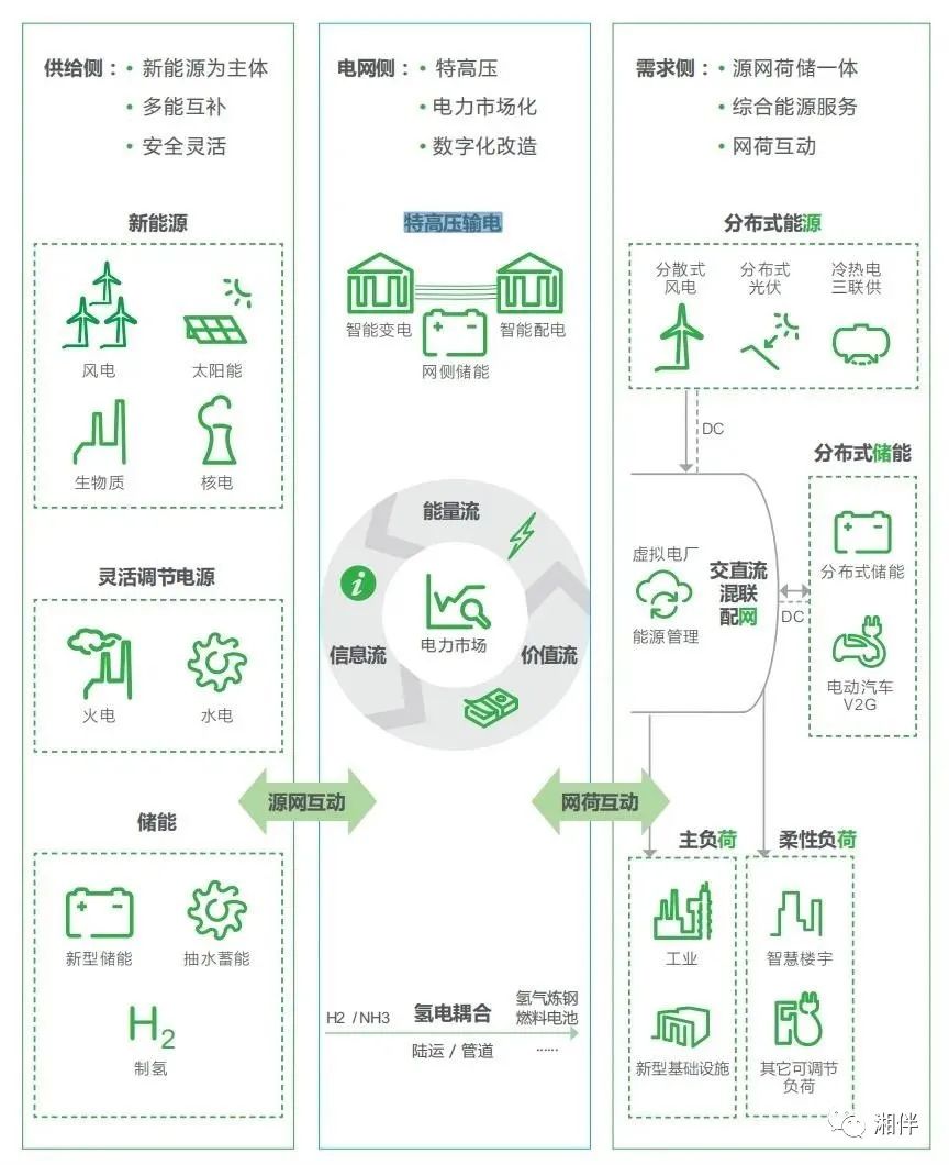與傳統(tǒng)電力系統(tǒng)相比,它強調(diào)的是以“新能源”為主體,逐步提升光伏、風電等新能源發(fā)電的比例,并通過電網(wǎng)系統(tǒng)運行的變革,實現(xiàn)新能源高效開發(fā)利用和各類負荷的友好接入,提升終端電氣化率,通過發(fā)電、輸電、配電、用電等各環(huán)節(jié)的共同發(fā)力,最終實現(xiàn)電力行業(yè)減排降碳目標??梢哉f,新型電力系統(tǒng)是我們邁向碳達峰碳中和的關(guān)鍵所在。