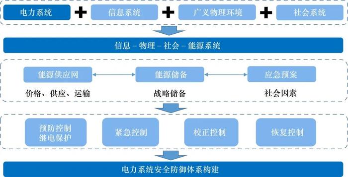 在信息物理社會系統(tǒng)框架方面,采用機(jī)理分析和沙盤推演手段,開展極端事件、綜合能源、政策機(jī)制、規(guī)劃運(yùn)行的“時(shí) ? 空 ? 物”要素分析;研究不確定性因素對能源 ? 電力可靠性及經(jīng)濟(jì)性的影響規(guī)律,構(gòu)建覆蓋電力系統(tǒng)運(yùn)行過程,具有多類目標(biāo)、多道防線能力的電力安全主動(dòng)防御體系。