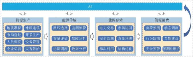 能源全產(chǎn)業(yè)鏈與AI的互相影響逐漸加深,如圖1所示。在能源生產(chǎn)環(huán)節(jié),AI技術(shù)應用于不可再生能源(煤、石油、天然氣等)地質(zhì)勘探、地質(zhì)建模過程,極大提高勘探的效率與準確性。在開采過程中,AI驅(qū)動的智能作業(yè)系統(tǒng)(設備)能夠根據(jù)實時地質(zhì)條件自動調(diào)整作業(yè)參數(shù),提高作業(yè)效率和安全性。從礦床開采全生產(chǎn)周期來看,基于AI分析的生產(chǎn)優(yōu)化模型可以通過協(xié)調(diào)調(diào)度和運營優(yōu)化,合理調(diào)配開采作業(yè)強度,優(yōu)化生產(chǎn)周期。在可再生能源生產(chǎn)方面,利用AI技術(shù)優(yōu)化選址、設備運行參數(shù)以及與其他能源形式的協(xié)同調(diào)度,在一定程度上可克服太陽能、風能等間歇性能源的不確定性,提升可再生能源在電網(wǎng)中的接入比例和穩(wěn)定性,促進能源結(jié)構(gòu)的優(yōu)化。