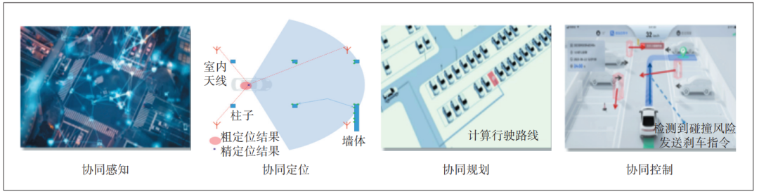 典型場景如智慧泊車,通過協(xié)同感知、協(xié)同定位、協(xié)同規(guī)劃和協(xié)同控制等技術(shù)實現(xiàn)高效、智能的停車管理和服務(wù)(見圖1)。智慧泊車的技術(shù)核心是根據(jù)多源傳感器異構(gòu)算法聯(lián)合感知的異步動態(tài)協(xié)同感知系統(tǒng),基于場側(cè)的無線通信技術(shù)和車輛即時定位與地圖構(gòu)建技術(shù)的協(xié)同定位系統(tǒng),同時基于先驗地圖和實時路況的全局路徑調(diào)度和車輛感知的局部軌跡規(guī)劃的協(xié)同系統(tǒng),以及場端原始感知數(shù)據(jù)及預(yù)測與車輛實時規(guī)劃軌跡的實時干涉控制系統(tǒng),實現(xiàn)車路云一體化的泊車服務(wù)。