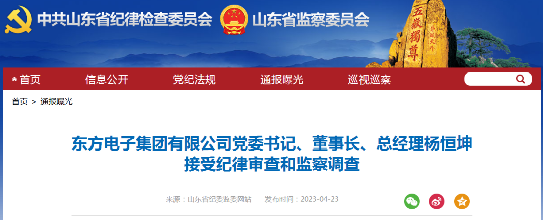 山東省紀(jì)委監(jiān)委網(wǎng)站4月23日消息,據(jù)煙臺市紀(jì)委監(jiān)委消息:東方電子集團(tuán)有限公司黨委書記、董事長、總經(jīng)理楊恒坤涉嫌嚴(yán)重違紀(jì)違法,目前正接受煙臺市紀(jì)委監(jiān)委紀(jì)律審查和監(jiān)察調(diào)查。