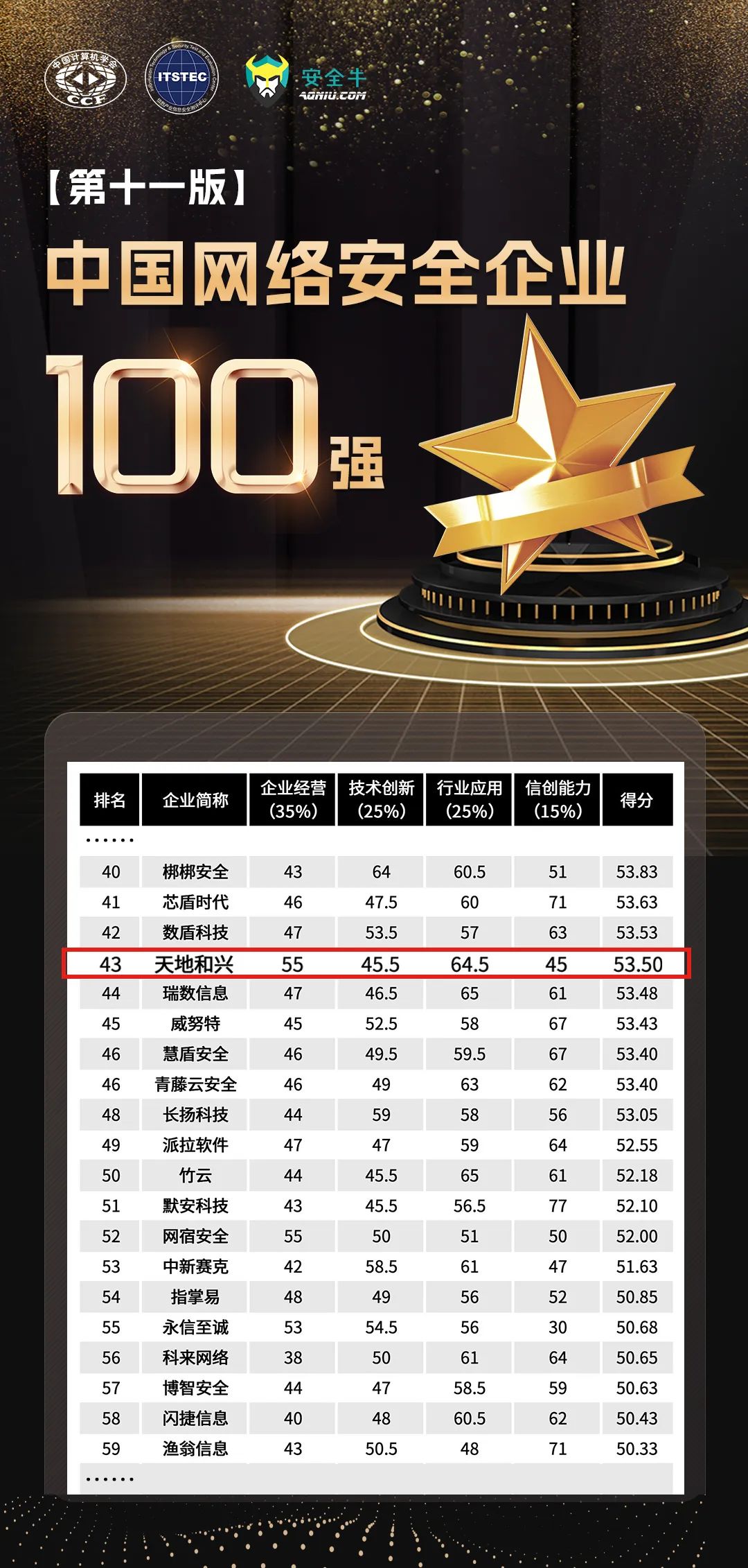 TOP50! 天地和興連續(xù)五年入選“中國網絡安全企業(yè)100強”