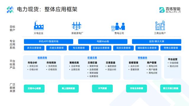 為了幫助發(fā)售電企業(yè)加速電力交易轉(zhuǎn)型,百煉智能基于先進的AI及數(shù)據(jù)分析技術(shù)、系統(tǒng)開發(fā)能力,自主研發(fā)“百煉智電”產(chǎn)品,為發(fā)售電企業(yè)建設(shè)一站式電力現(xiàn)貨市場交易及決策平臺,強化企業(yè)管控水平、決策能力以及用戶服務(wù)能力,實現(xiàn)電力交易收益最大化。