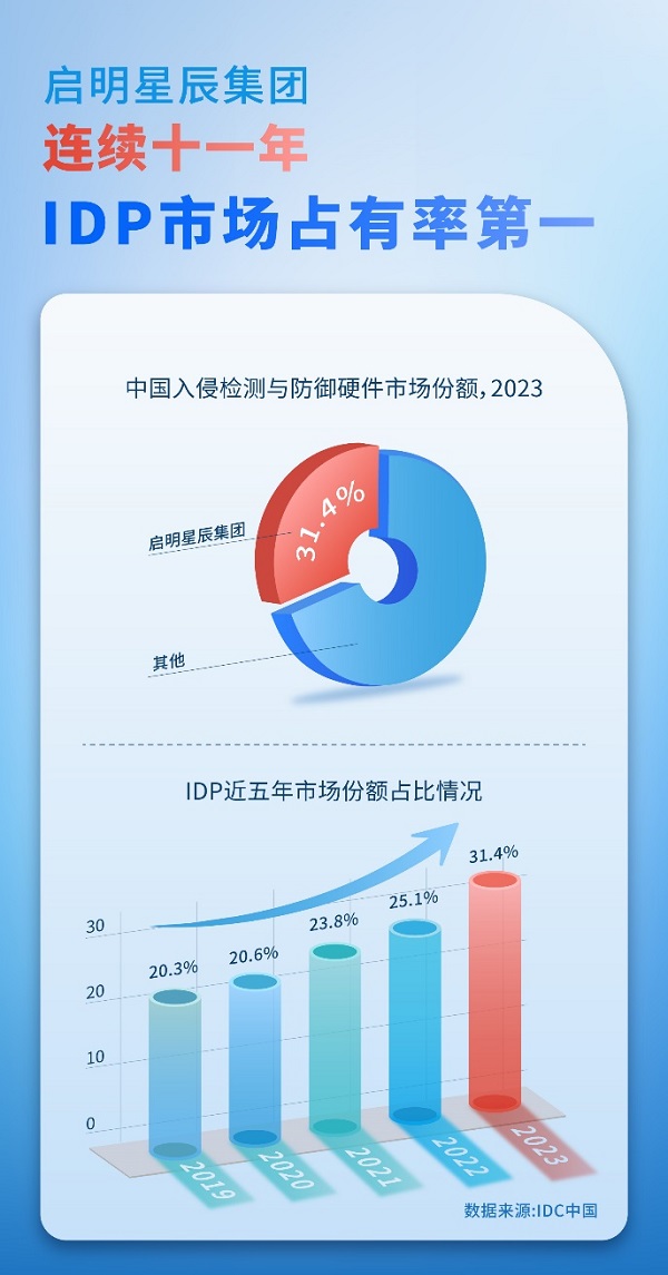 本網(wǎng)訊 近日,IDC發(fā)布《2023年第四季度中國IT安全硬件市場跟蹤報(bào)告》。報(bào)告顯示,2023年啟明星辰集團(tuán)入侵檢測與防御(IDP)以31.4%的市場份額再次蟬聯(lián)國內(nèi)市場第一。至此,啟明星辰集團(tuán)已連續(xù)十一年領(lǐng)跑IDP市場,且連續(xù)多年份額占比持續(xù)攀升!