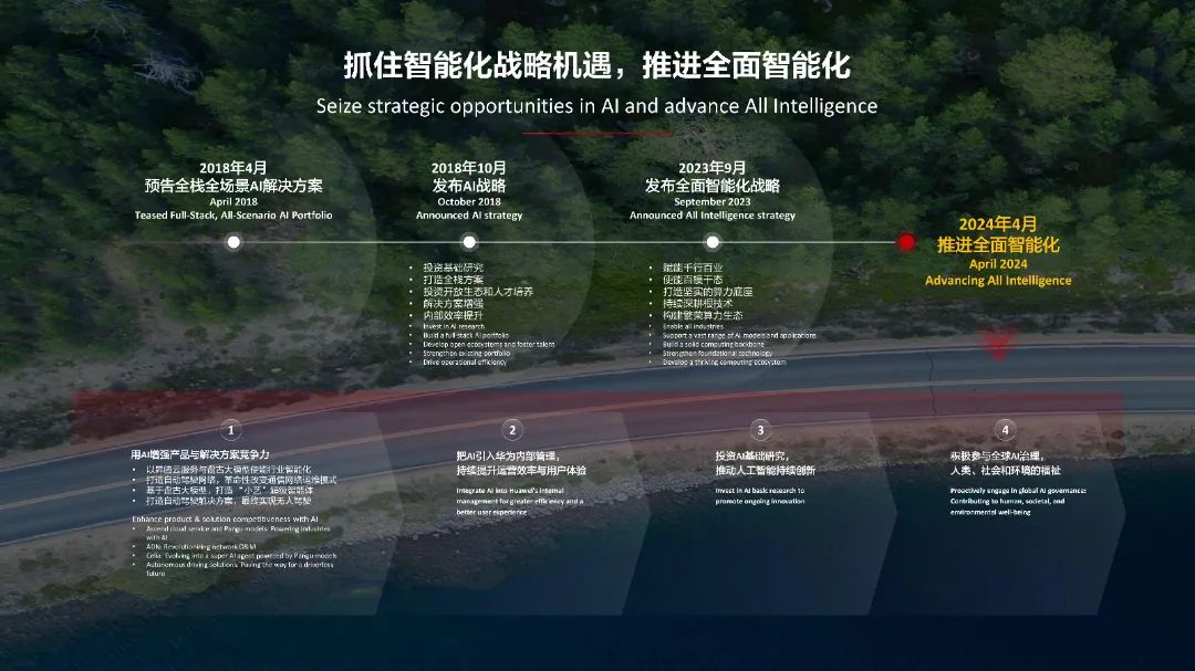 ? 第五個舉措,也是今天要重點闡述的,華為如何抓住智能化戰(zhàn)略機遇,推進全面智能化。華為公司的AI戰(zhàn)略以及全棧全場景AI解決方案是在2018年4月的分析師大會向大家預告的,并在2018年10月的全聯(lián)接大會正式發(fā)布的。在2023年9月的全聯(lián)接大會上,華為進一步發(fā)布了全面智能化的戰(zhàn)略,今天我將更具體地闡述華為如何來全面推進智能化。
