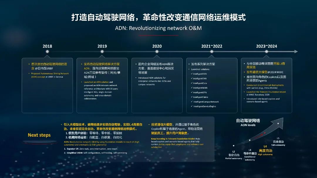 ? 打造自動駕駛網(wǎng)絡(luò),革命性改變通信網(wǎng)絡(luò)運維模式。電信運營商網(wǎng)絡(luò)運維是非常復雜的,因此成本也非常高。因此在2018年的日內(nèi)瓦UBBF,華為參考汽車自動駕駛的分級理念提出了自動駕駛網(wǎng)絡(luò)的概念,也就是ADN(Autonomous Driving Network)。經(jīng)過這么多年和電信運營商持續(xù)的探討、聯(lián)合創(chuàng)新,形成了大量的ADN解決方案,到今天,ADN已經(jīng)成為網(wǎng)絡(luò)運維智能化轉(zhuǎn)型的戰(zhàn)略共識。而大模型出來以后,自動駕駛網(wǎng)絡(luò)的目標更加具有現(xiàn)實意義了,運營商都希望自己的網(wǎng)絡(luò)能夠盡快實現(xiàn)自動駕駛、實現(xiàn)L4高度自治,未來實現(xiàn)完全自治,帶來以“零等待、零中斷、零接觸”為標志的極致的用戶體驗,和以“自配置、自修復、自優(yōu)化”為標志的極簡的網(wǎng)絡(luò)運維。華為將與中國及全球運營商合作打造通信大模型,并首先通過基于角色的Copilot和基于場景的Agent,幫助運營商賦能員工,提升用戶滿意度,讓運營商盡快因大模型技術(shù)和自動駕駛網(wǎng)絡(luò)而獲益。