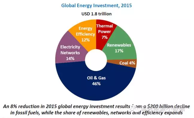 雖說油氣投資大幅下降,但是在全球1.83萬億的能源投資總額中,油氣投資占比達(dá)到46%??稍偕茉赐顿Y占17%;火電發(fā)電廠投資占7%,電力輸配網(wǎng)投資占14%;能效投資占12%;煤炭開采和運(yùn)輸投資僅占4%。
