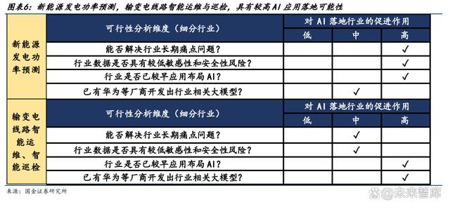面向行業(yè)主要衡量的維度有: 1) 能否解決長期痛點問題:電網(wǎng)承擔(dān)最主要的功能是維持用電側(cè)與電網(wǎng)側(cè)動態(tài)平衡,而 新能源裝機比例上升無疑加大了電力調(diào)度與消納的難度,因此若 AI 加持能有效解決 消納相關(guān)細分環(huán)節(jié)的痛點問題,相關(guān)政策導(dǎo)向和資金投入將有望向此環(huán)節(jié)傾斜。 2) 行業(yè)數(shù)據(jù)是否具有較低敏感性和安全性風(fēng)險:大模型需要通過海量數(shù)據(jù)訓(xùn)練,而電網(wǎng) 行業(yè)本身涉及到民生用電與數(shù)據(jù)安全性問題,部分信息不便用于大規(guī)模公開訓(xùn)練,因 此若某一細分環(huán)節(jié)數(shù)據(jù)敏感性較低或用戶已授權(quán)使用,則大模型將更快接入落地。 3) 行業(yè)是否已較早應(yīng)用布局 AI/技術(shù)實踐:電網(wǎng)多個應(yīng)用場景較早地應(yīng)用了 AI 技術(shù),例 如輸變電線路運維和巡檢方面,2011 年開始,部分企業(yè)就已開展了通過 AI 對電力設(shè) 備外表缺陷進行識別、預(yù)測、跟蹤運行等研究探索。 4) 已有華為等廠商開發(fā)出行業(yè)相關(guān)大模型:例如華為盤古 CV 視覺大模型,已在 L2 級 細分場景上,推出基于電力大模型的無人機電力巡檢、電力缺陷識別等場景模型。