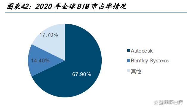 信創(chuàng)發(fā)展背景下,BIM 行業(yè)國產(chǎn)化替代需求強(qiáng)烈。信息技術(shù)應(yīng)用創(chuàng)新為近年以來我國關(guān)鍵 命題,旨在通過對 IT 硬件、軟件的重構(gòu),建立我國自主可控的 IT 產(chǎn)業(yè)標(biāo)準(zhǔn)和生態(tài),逐步 實(shí)現(xiàn)各環(huán)節(jié)國產(chǎn)替代。國內(nèi)使用的 BIM 平臺主要為國外軟件,而國內(nèi)廠商主要以項(xiàng)目管理 和單點(diǎn)應(yīng)用類型的產(chǎn)品為主,底層核心技術(shù)大多掌握在國外廠商手中。2020 年全球 BIM 行業(yè)市場中,Autodesk 市占率為 67.9%,其次 Bentley Systems 市占率為 14.37%,CR2 集中度較高,顯示出國產(chǎn)替代的必要性和緊迫性。