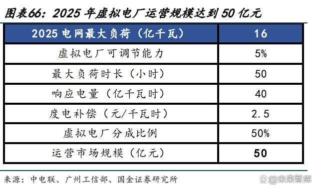 預(yù)計 2025 年虛擬電廠投資規(guī)模達(dá)到 800 億元,運(yùn)營市場規(guī)模達(dá)到 50 億元?,F(xiàn)階段主要 的盈利模式為通過需求側(cè)響應(yīng)賺取輔助服務(wù)費(fèi)用后的分成。據(jù)中電聯(lián)預(yù)計,2025 年我國 全社會用電量將達(dá) 9.5 萬億千瓦時,而最大負(fù)荷將達(dá)到 16 億千瓦,按 5%可調(diào)節(jié)能力、投 資成本 1000 元/千瓦計算,預(yù)計到 2025 年,虛擬電廠投資規(guī)模有望達(dá) 800 億元。參考目 前峰值負(fù)荷時長水平,我們預(yù)計 2025 峰值負(fù)荷將達(dá)到 50 小時,對應(yīng) 2025 年電網(wǎng)需求側(cè) 響應(yīng)電量 40 億千瓦時。目前我國虛擬電廠處于發(fā)展初期,度電補(bǔ)償較高以刺激時長,參 考《廣州市虛擬電廠實(shí)施細(xì)則》0-5 元/千瓦時的削峰響應(yīng)補(bǔ)貼,預(yù)計 2025 年虛擬電廠進(jìn) 入商業(yè)化運(yùn)營后,補(bǔ)償標(biāo)準(zhǔn)為 2.5 元/千瓦時。假設(shè)分成比例為 50%,則預(yù)計 2025 年虛擬 電廠運(yùn)營市場規(guī)模將達(dá)到 50 億元。