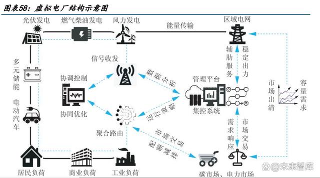 虛擬電廠本質(zhì)上是一套軟件平臺系統(tǒng),核心為“通信”和“聚合”。通過先進(jìn)信息通信技 術(shù)和軟件系統(tǒng),實(shí)現(xiàn)分布式電源、儲能系統(tǒng)、可控負(fù)荷、電動汽車等分布式能源資源的聚 合和協(xié)調(diào)優(yōu)化,以作為一個特殊電廠參與電力市場和電網(wǎng)運(yùn)行的電源協(xié)調(diào)管理系統(tǒng),為配 電網(wǎng)和輸電網(wǎng)提供管理和輔助服務(wù)。虛擬電廠概念的核心可以總結(jié)為“通信”和“聚合”, 關(guān)鍵技術(shù)主要包括協(xié)調(diào)控制技術(shù)、智能計量技術(shù)以及信息通信技術(shù)。 虛擬電廠分為兩類:“負(fù)荷類”虛擬電廠,和“源網(wǎng)荷儲一體化”虛擬電廠。1)“負(fù)荷類” : 聚合了具備調(diào)節(jié)能力的電動汽車、充電樁等市場化用戶,作為一個整體,對外提供負(fù)荷側(cè) 靈活性相應(yīng)調(diào)節(jié)服務(wù)。2)“源網(wǎng)荷儲一體化”:聚合新能源發(fā)電、用戶及配儲一系列環(huán)節(jié), 作為獨(dú)立市場主體參與電力市場、具備自主調(diào)峰調(diào)節(jié)能力。 具備“源-荷”雙重身份,有效實(shí)現(xiàn)削峰填谷。虛擬電廠把各類可調(diào)負(fù)荷資源匯聚,根據(jù) 電網(wǎng)削峰填谷的需求,進(jìn)行線上填報,計劃下發(fā),執(zhí)行反饋,類似于線上工單派單系統(tǒng)。 電網(wǎng)給調(diào)度指令計劃,需求響應(yīng)調(diào)控計劃,提前幾天/幾周把計劃發(fā)下來。負(fù)荷集成商, 虛擬電廠運(yùn)營商,會把計劃告訴客戶,哪些時段把負(fù)荷停掉,把用電負(fù)荷降下來,具有源 -荷雙重身份。