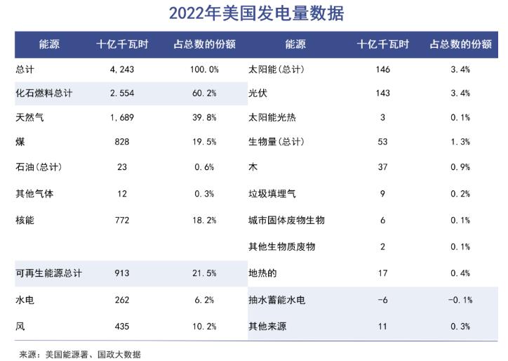 在《通脹削減法案》的刺激下,美國在新能源的道路上疾馳,煤電貢獻度明顯下降,風(fēng)光等可再生能源逐漸成為主力軍。2022年,美國煤電份額從23%減少到20%,核能從20%減少到18%。